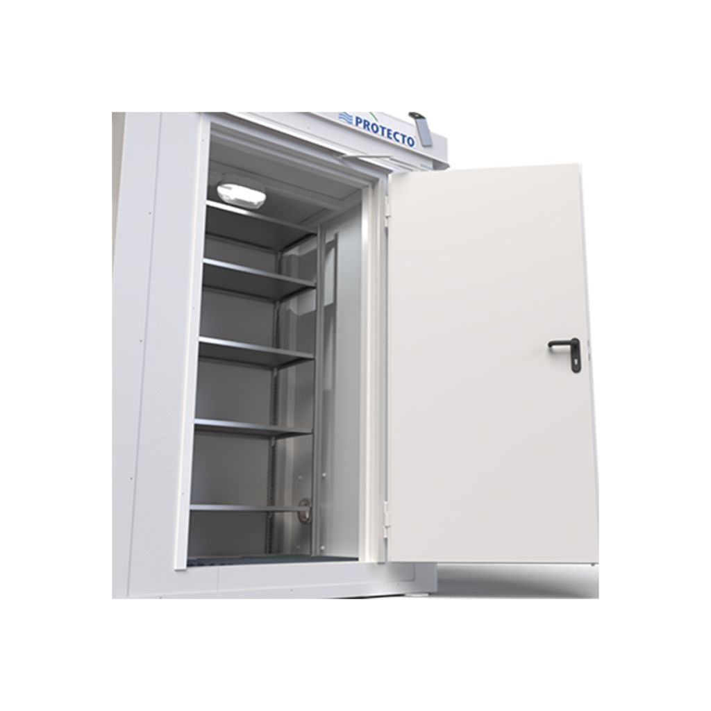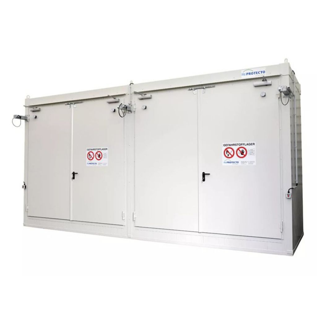 Eine besonders platzsparende Lösung zur sicheren Lagerung von Gefahrstoffen bietet der Container-Typ F-SAFE Brandschutzdepot F90 von PROTECTO mit der aktuellen und gesetzeskonformen DIBt-Zulassung. Auch dieses Modell gewährleistet 90 Minuten Feuerwiderstand (F90) von außen nach innen bzw. von innen nach außen. In speziellen Anwendungsfällen erlaubt das Brandschutzdepot individuelle Optionen wie etwa den Einbau von Gas- und Brandmeldern sowie Klimaanlagen.